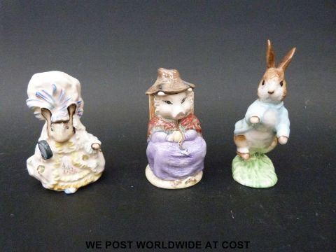 Six Royal Albert Beatrix Potter figures including Lady Mouse, Mrs Tittlemouse, Peter Rabbit, Jeremy Fisher and Hunca-Munca sweeping