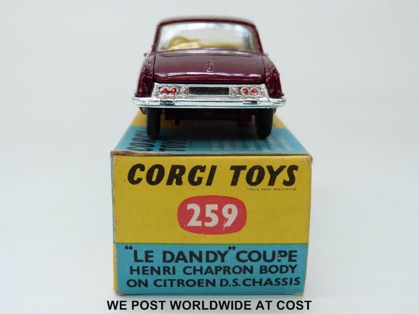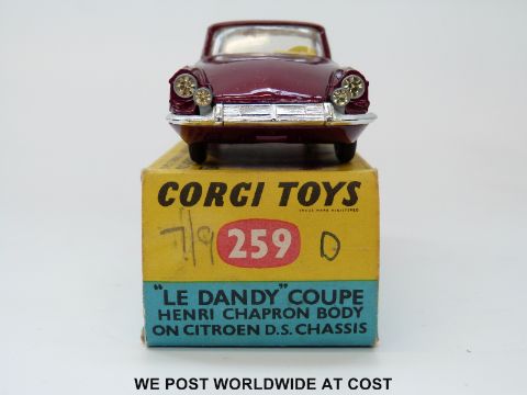 Corgi Toys diecast model 'Le Dandy' Coupe Henri Chapron Body on Citroen DS Chassis, 259, with metallic dark red body, yellow interior and wire wheels, in original box.
