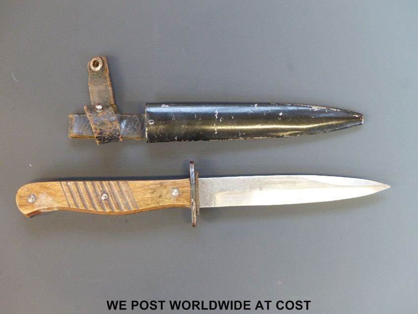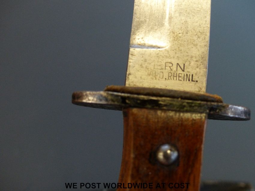 A WWI close combat German trench fighting knife, made by ERN, with 5½ inch clean single edged blade, the handle with grooved slabbed sides, complete with leather washer, in black steel scabbard with riveted belt loop