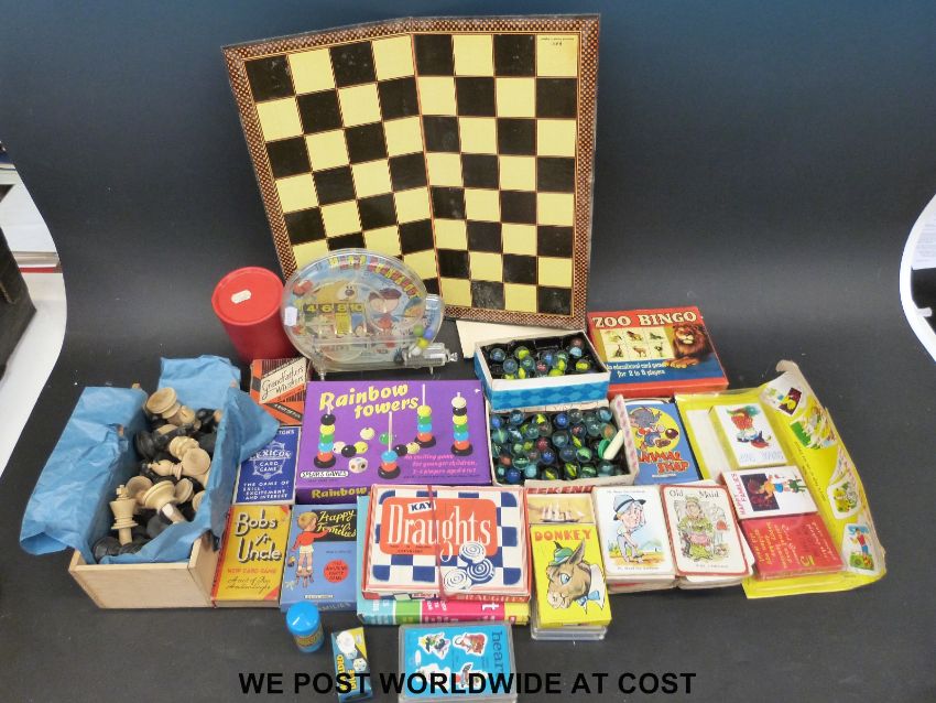 A collection children's card games etc C1930s onwards including Bob's Your Uncle, Happy Families etc together with wooden chess pieces and marbles