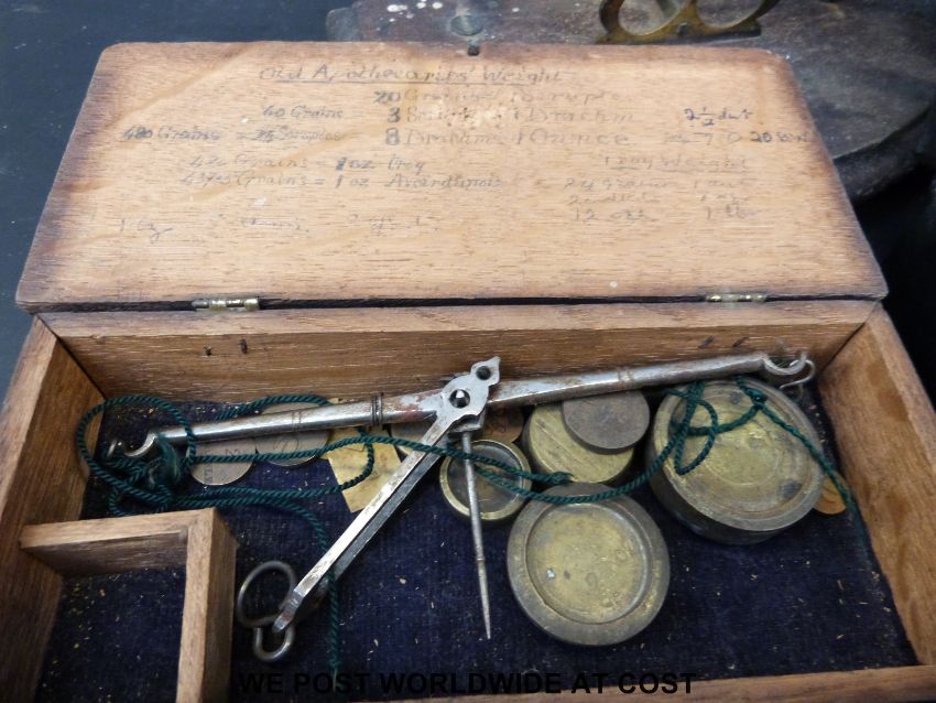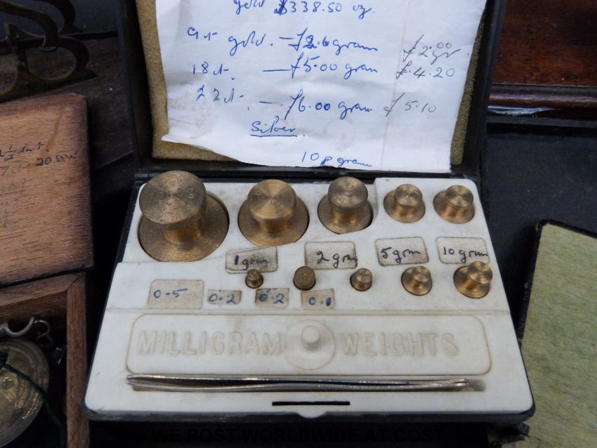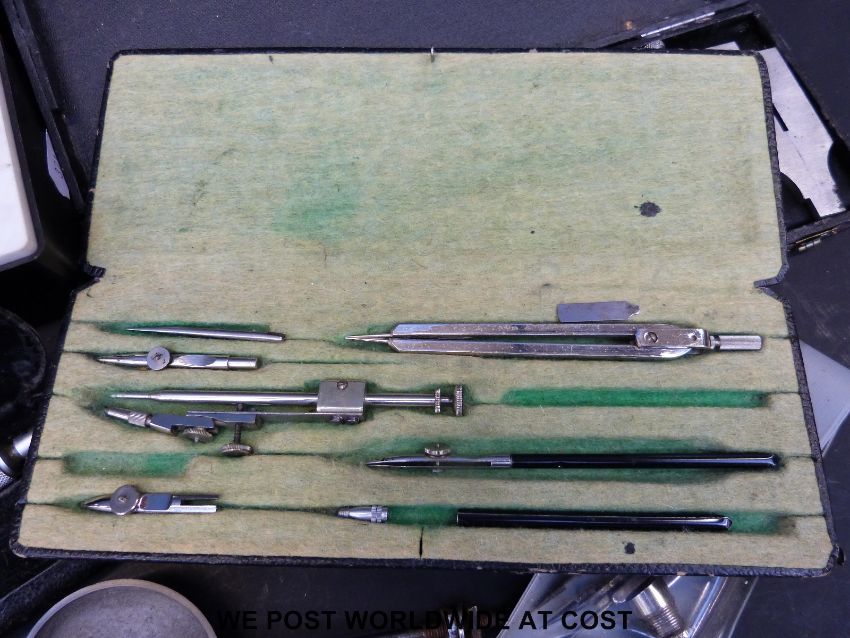 A quantity of weights and scales to include milligram boxed weights, cased postal scales and C. Stevens & Son scales together with a quantity of drawing and engineering instruments and tools, many cased