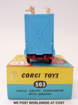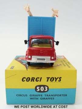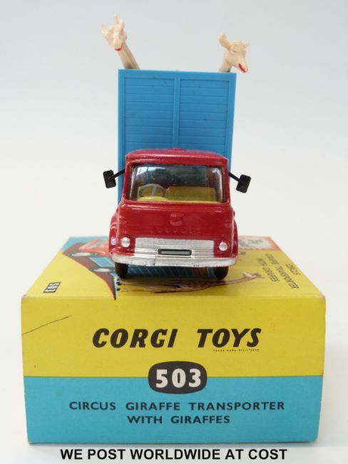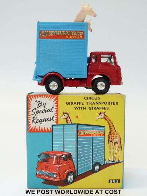Corgi Toys diecast model Chipperfields Circus Giraffe Transporter, 503, with red and blue Bedford TK, spun wheels and two giraffes, in original box.