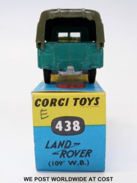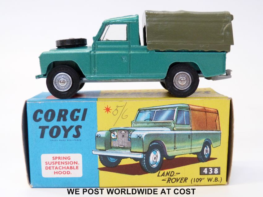 Corgi Toys diecast model Land Rover 109 W.B, 438, with metallic green body, olive green canopy, yellow interior and shaped hubs, in original box.