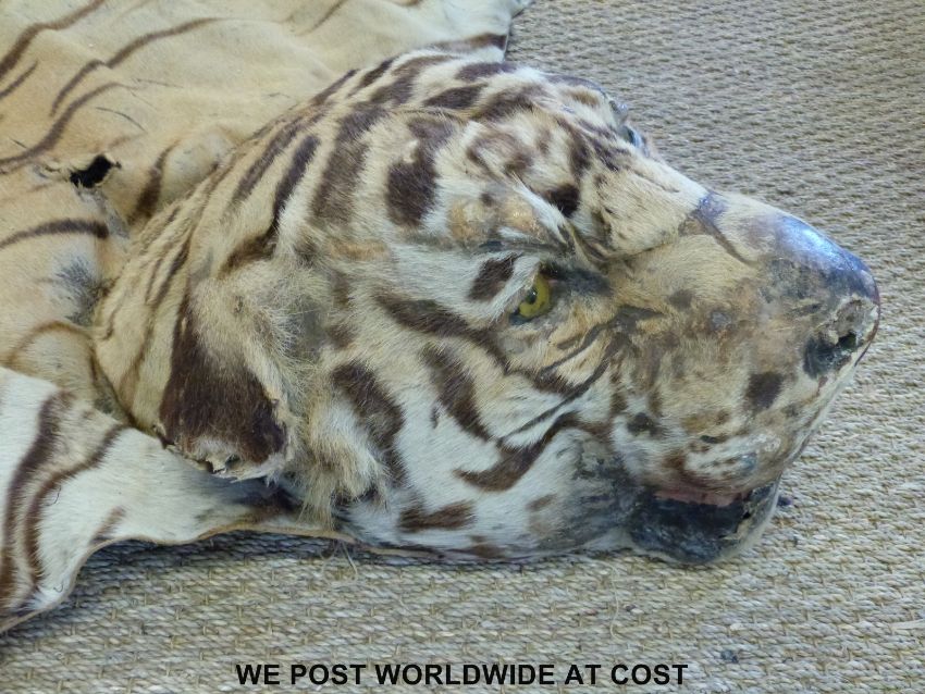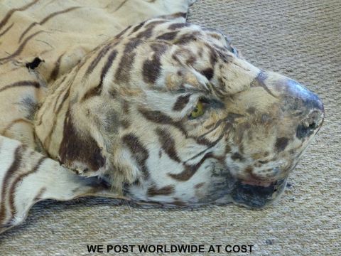 A late 19th or early 20th taxidermy tiger skin rug with head and claws (length 240cm) with Guild of Taxidermists inspection certificate
