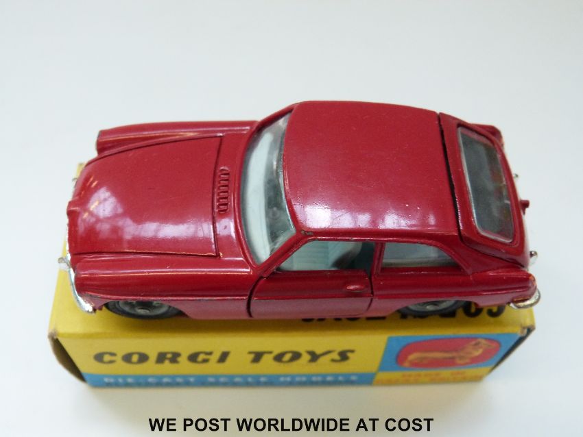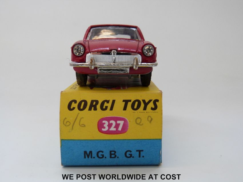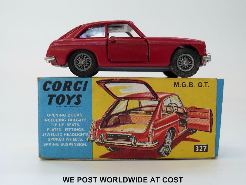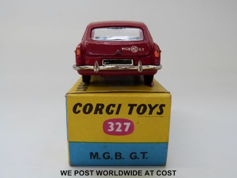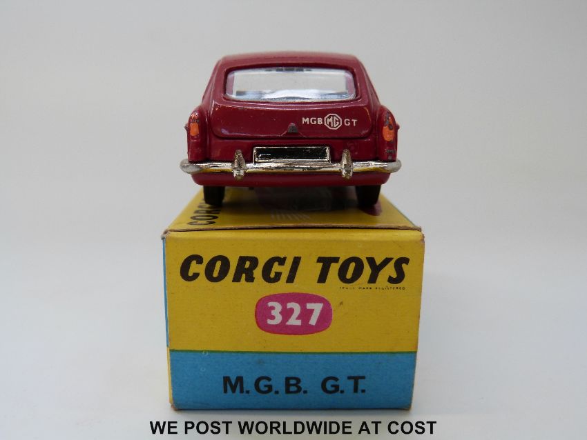 Corgi Toys diecast model MGB GT, 327, with dark red body, pale blue interior, spoked wheels and suitcase, in original box with leaflet