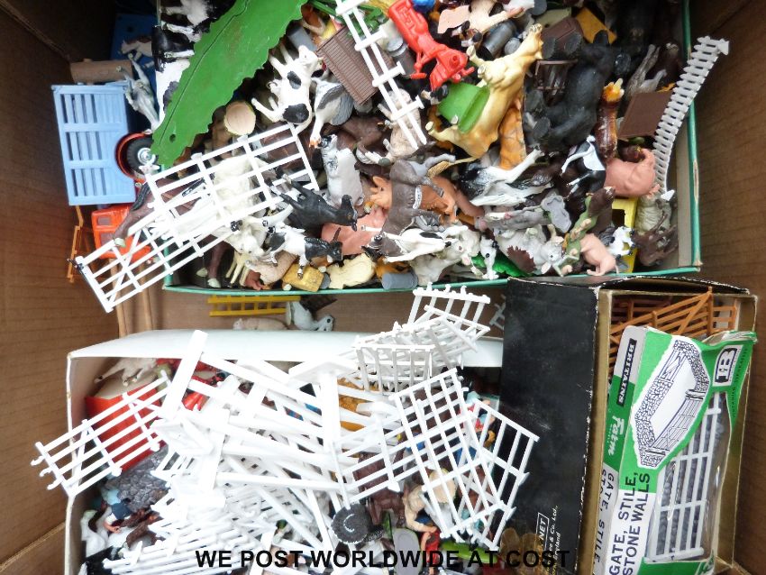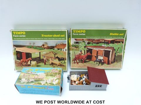 A farm layout together with stable and a large collection of farm animals including tractor shed set Blue Box, Husky, Tri-ang, Cresent etc