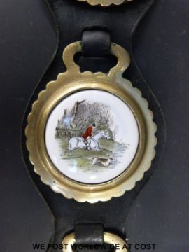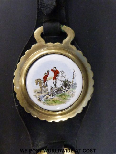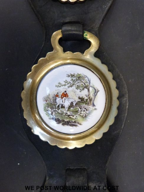A quantity of martingales with brasses including clover leaf design, crescent with star to centre, ceramic mounted etc