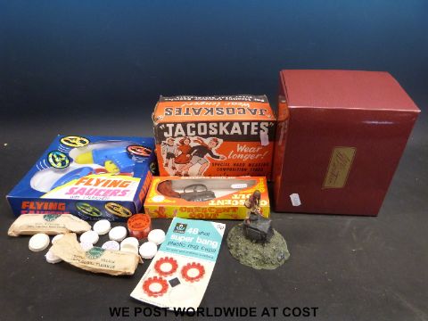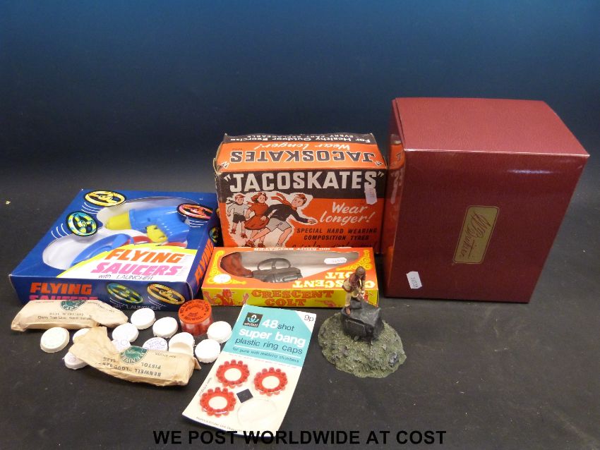 A Crescent 'Colt' cap gun, together with a flying saucer launcher, a pair of skates and a Britains Arthur figure, all in original boxes