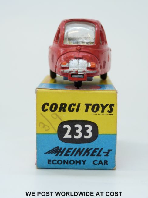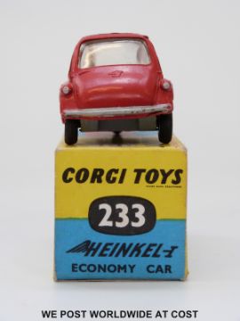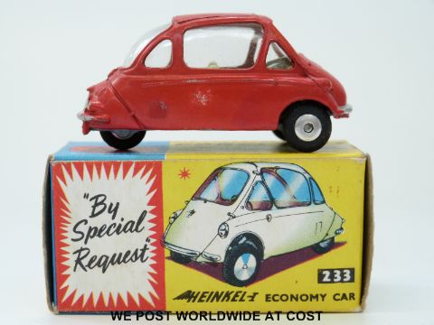 Corgi Toys diecast model Heinkel Trojan Economy Car, 233, with red body and lemon interior, in original box.