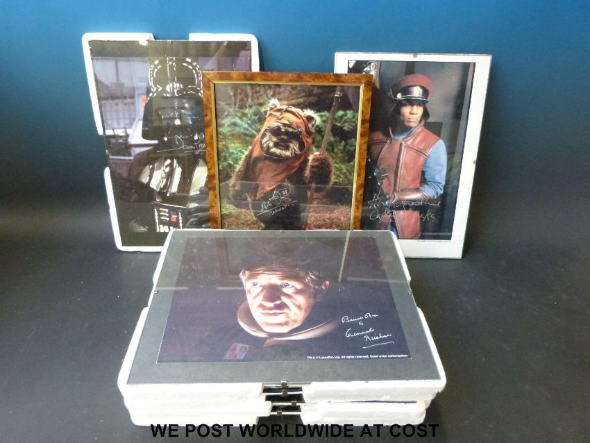 Nine signed Star Wars photographs, Dave Prowse, Jeremy Bullock, Peter Mayhew, Kenny Baker, Paul Blake, Hugh Quarshie, Bruce Boa, Michael Sheard and Warwick Davies, all in glass displays