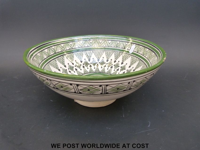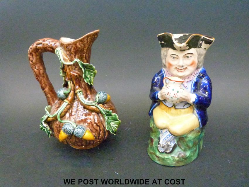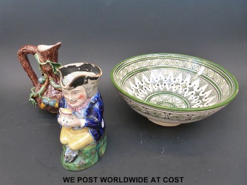 A bark effect jug with applied acorns, a Toby jug, and a Moroccan Art Deco style bowl