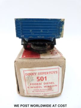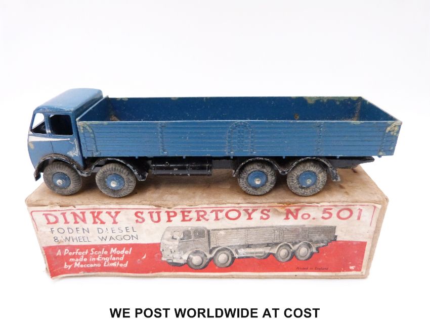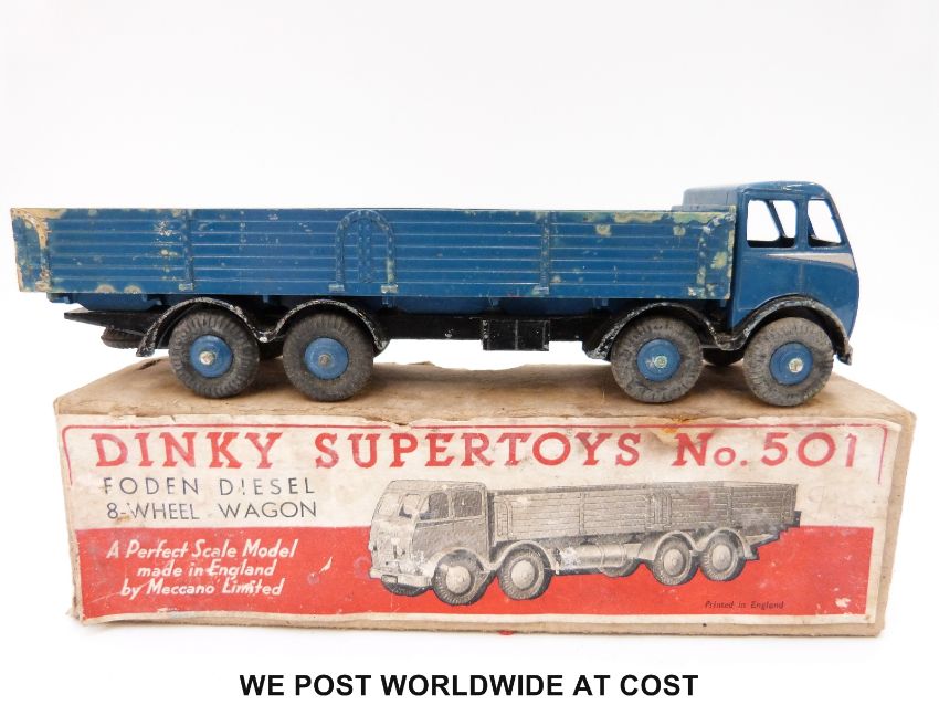 Dinky Supertoys diecast Foden Diesel 8-Wheel Wagon, first version 501, with blue body, silver flash to cab, black chassis and blue hubs, in original box
