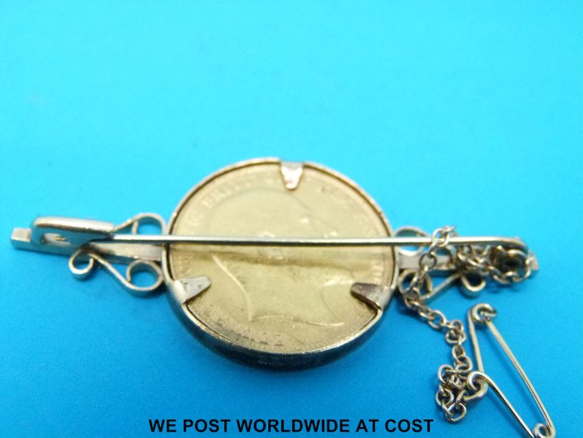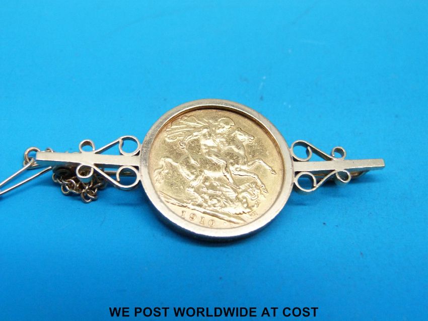 A 9ct gold brooch set with a 1910 gold full sovereign (12.1g)