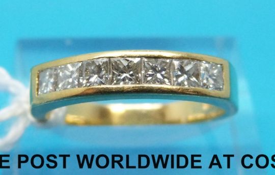 An 18ct gold half eternity ring set with princess cut diamonds in a bezel setting (size O)