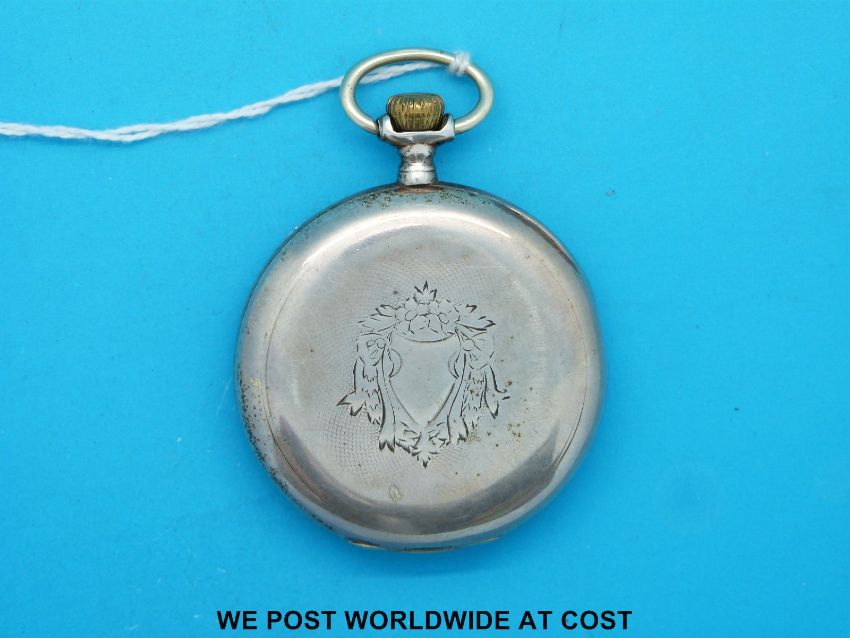 A white metal Omega pocket watch marked 800 with Arabic numerals and subsidiary seconds dial