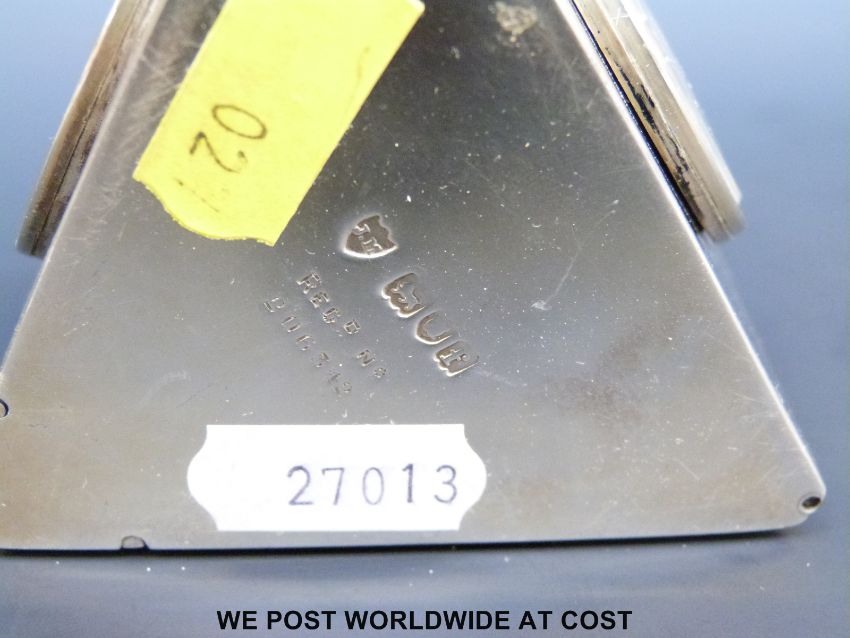 An Edward VII hallmarked silver cased clock, perpetual calendar, barometer and compass of triangular section with swing handle, London 1901, maker John Marger and with registered design number 206342 (height including handle 10cm)