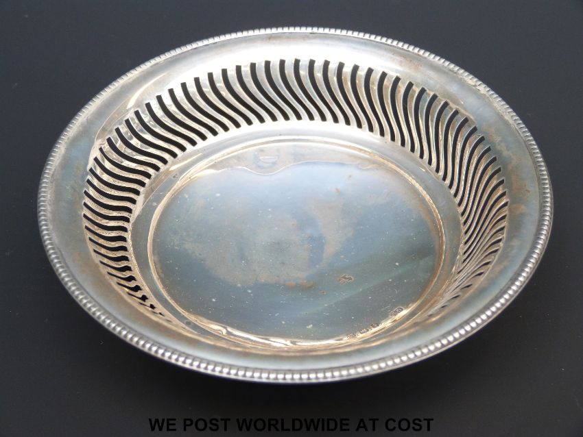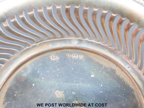 A hallmarked silver pierced bonbon dish raised on three ball feet, Birmingham 1911, diameter 13cm (71g)