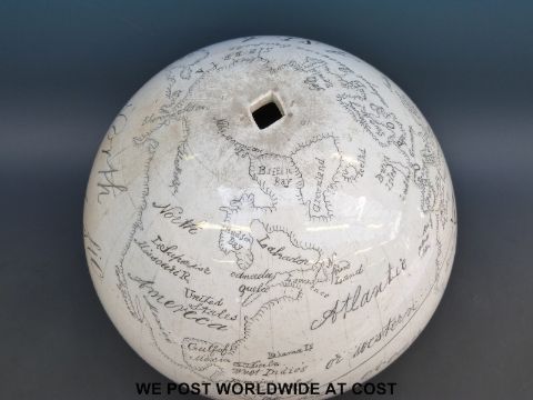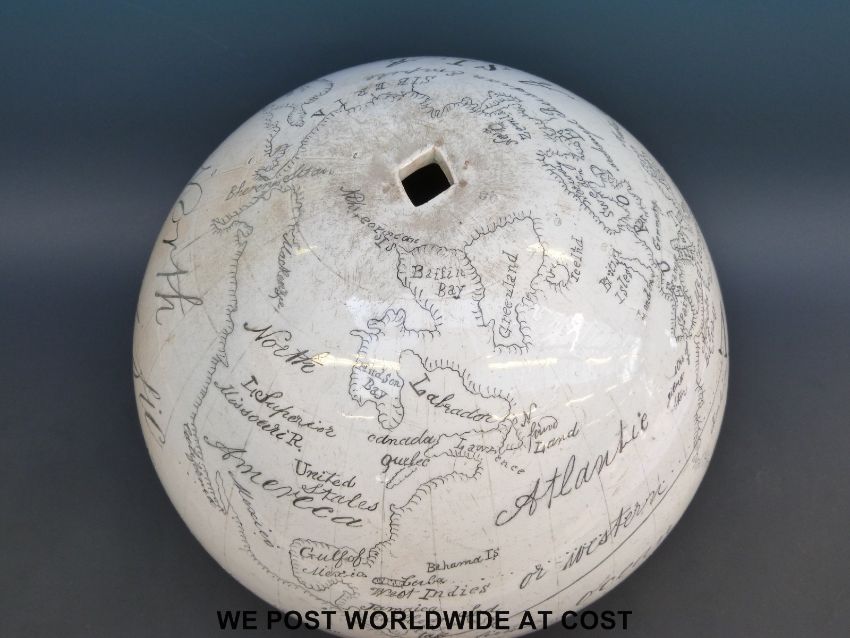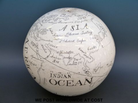 An unusual and possibly unique mid 19thC ceramic globe, possibly Coalport or Spode. The vendor's great grandfather worked for the Coalport factory and the globe belonged to him, it bears the monogram R W, his initials. It is almost certainly pre 1856 as it shows Van Diemen's land, which became Tasmania after this date (diameter 30cm)