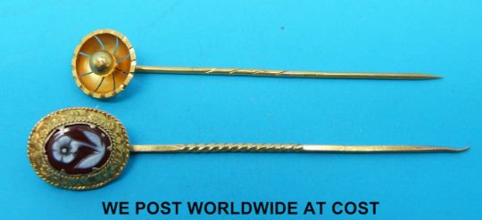 A Victorian stick pin marked 15ct and a Victorian yellow metal stick pin set with an agate cameo of a flower