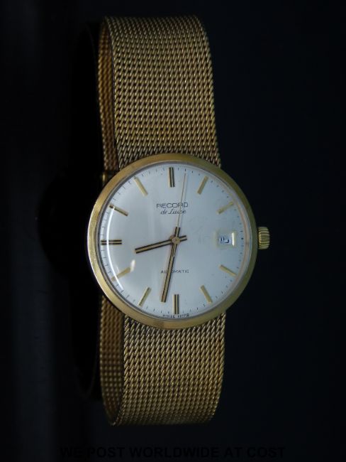 Record de Luxe 9ct gold gentleman's automatic wristwatch with two tone hands and markers and date aperture on 9ct gold bracelet, case diameter 35mm, 66g