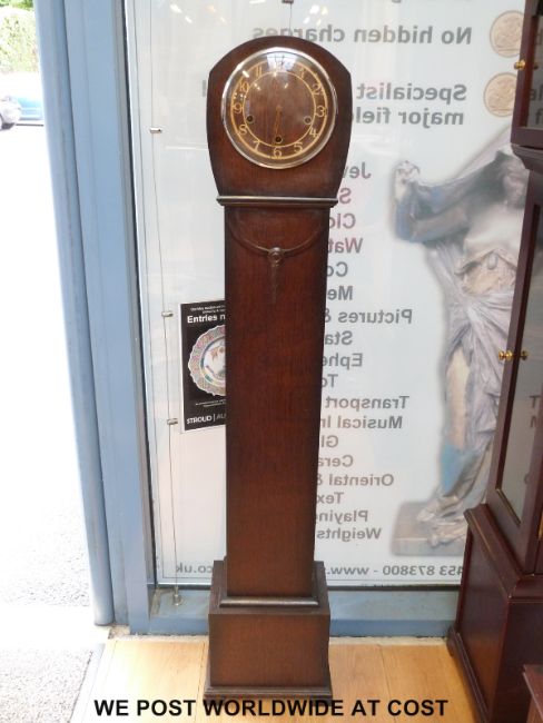 A c1930's oak cased granddaughter longcased clock with Smith's Enfield three train chiming movement, skeleton hands and utility dial, 132cm tall