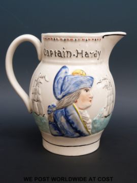 A relief moulded Admiral Nelson Captain Hardy jug (15cm tall)