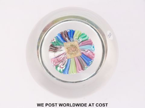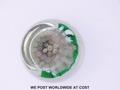 Five Murano millefiori glass paperweights, the largest with three blocks of red, white and green canes (105mm in diameter), one with millefiori mushroom tuft (80mm in diameter) and two with various millefiori canes (both 85mm in diameter)