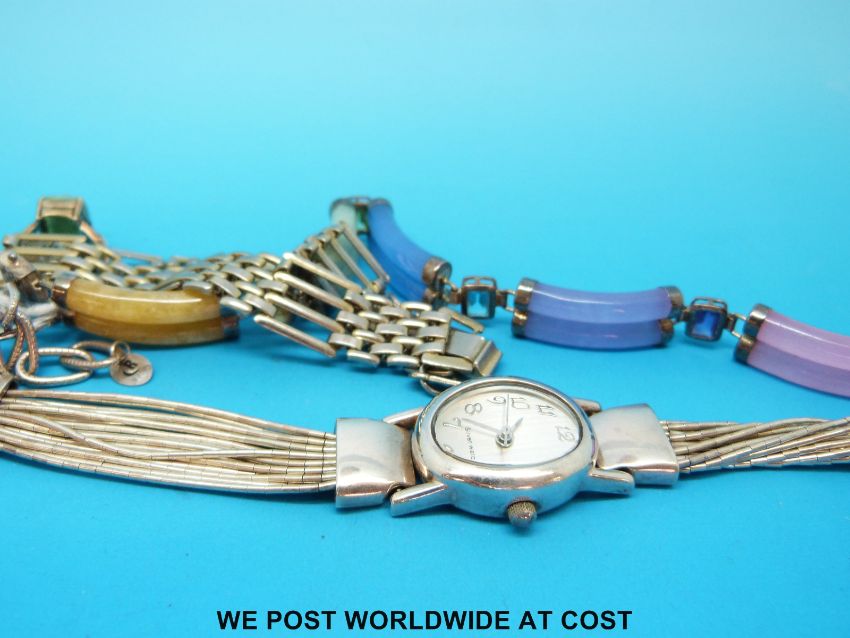 A ladies silver dress watch together a silver bracelet, a 9ct gold ring set with jadeite and a silver ring