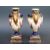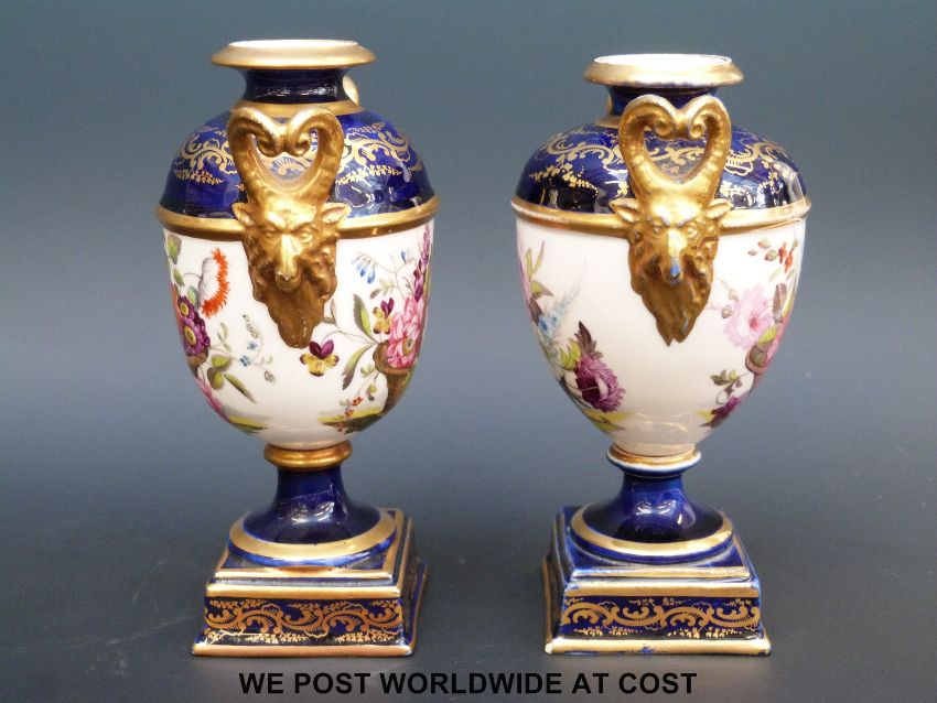 A pair of English porcelain pedestal urns with twin ram mask handles and hand decoration of flowers (14cm tall)