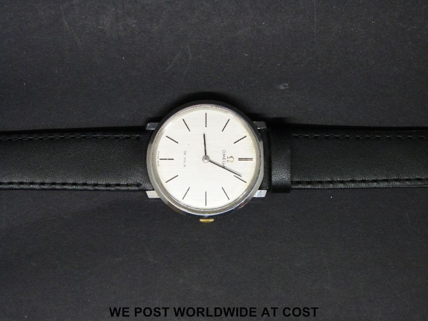 Omega DeVille gentleman's wristwatch with gold Omega symbol, baton markers, white face and gold winder, on black leather strap, case diameter 33mm