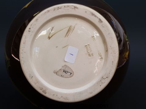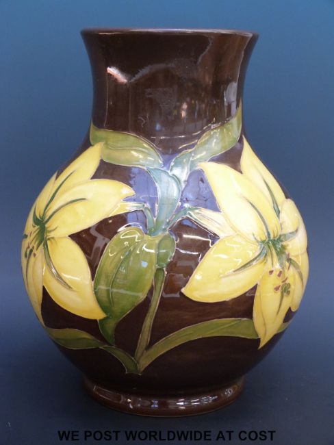 A large Moorcroft vase in Lily pattern on a brown ground (10" tall)