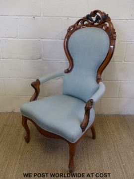 Two 'his & hers' 19thC carved mahogany upholstered chairs with serpentine fronts