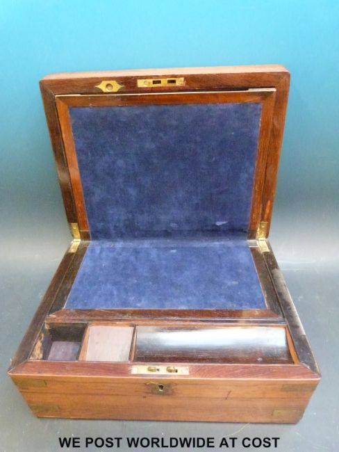 A 19thC brass bound writing slope with fitted interior, Wilkinson Sword letter opener and three vintage jewellery boxes