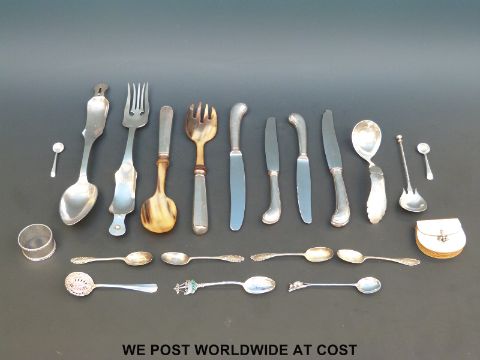 A quantity of hallmarked silver cutlery, silver napkin ring and a white metal spoon marked sterling (110g) together with a pair of white metal salad servers and a ladle with Dutch silver marks (192g), a pair of white metal handled salad servers, further spoon and an ivory covered purse