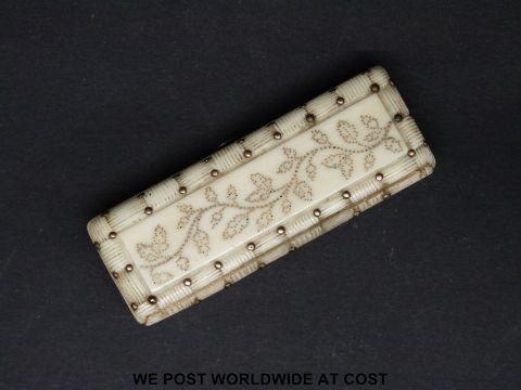 A 19thC gold inlaid carved ivory patch box with mirror, length 6.25cm