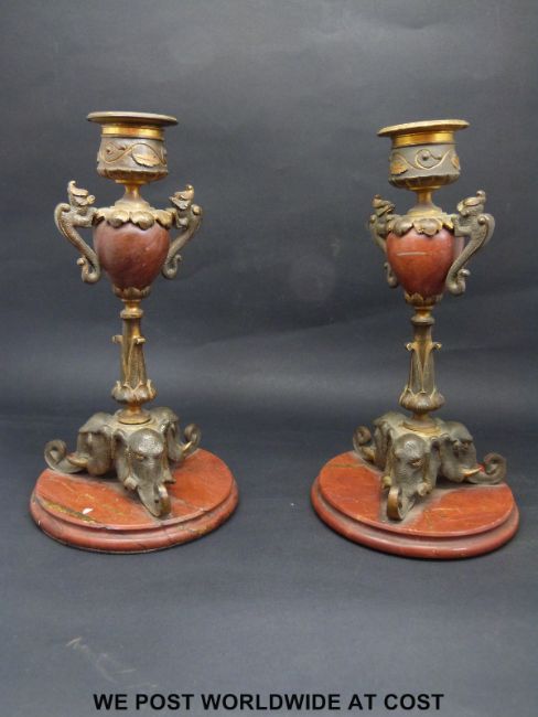 A pair of marble, bronze and part gilt candlesticks, the bases formed as elephants heads, height 19cm