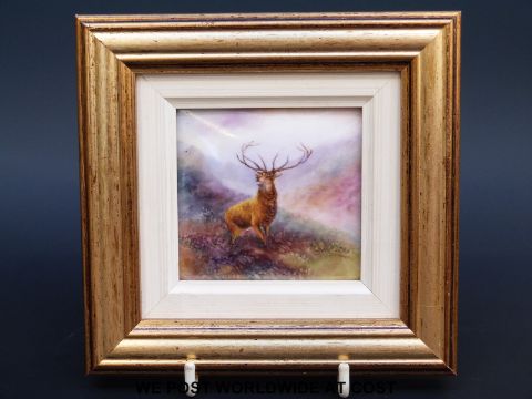 A c1926 Royal Worcester framed and mounted plaque of a Highland stag, unsigned, probably Stinton (6.5 x 7.0cm)