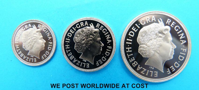 A cased set of UK gold proof coins comprising double sovereign, sovereign and half sovereign, 2002 with certificate no 2045