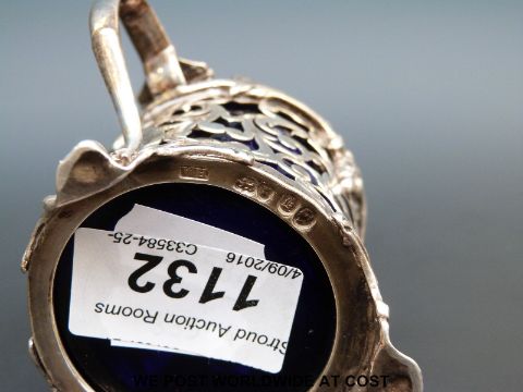 A Victorian hallmarked silver mustard pot with blue glass liner and leaf finial, London 1843, maker Williams Hunter