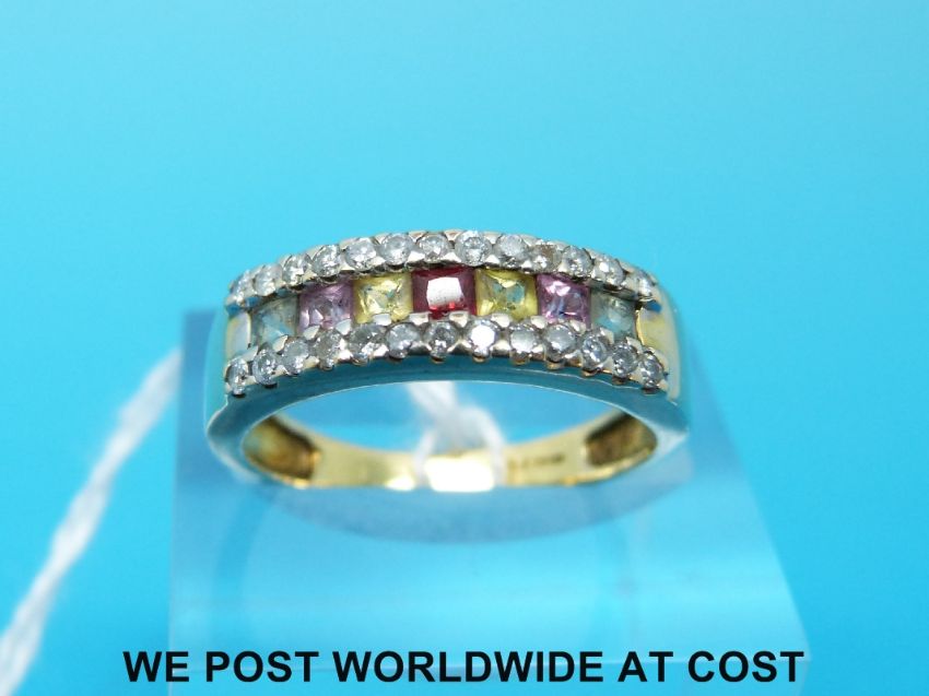A 9ct gold ring set with diamonds and a row of multi coloured sapphires (size N)