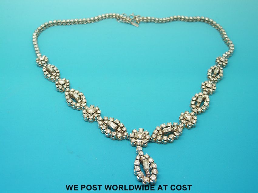 An 18ct white gold necklace set with round brilliant cut and baguette cut diamonds in circular and navette shaped clusters, the largest diamond approximately 0.65ct