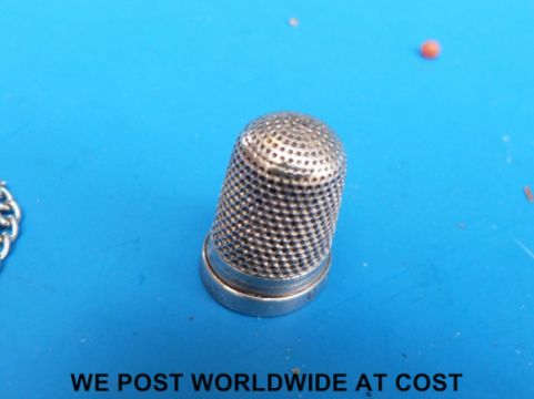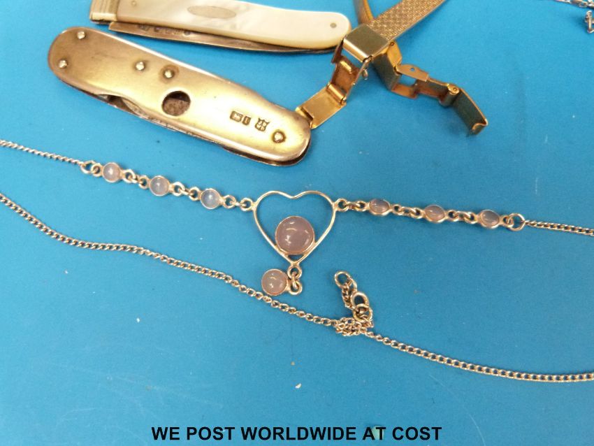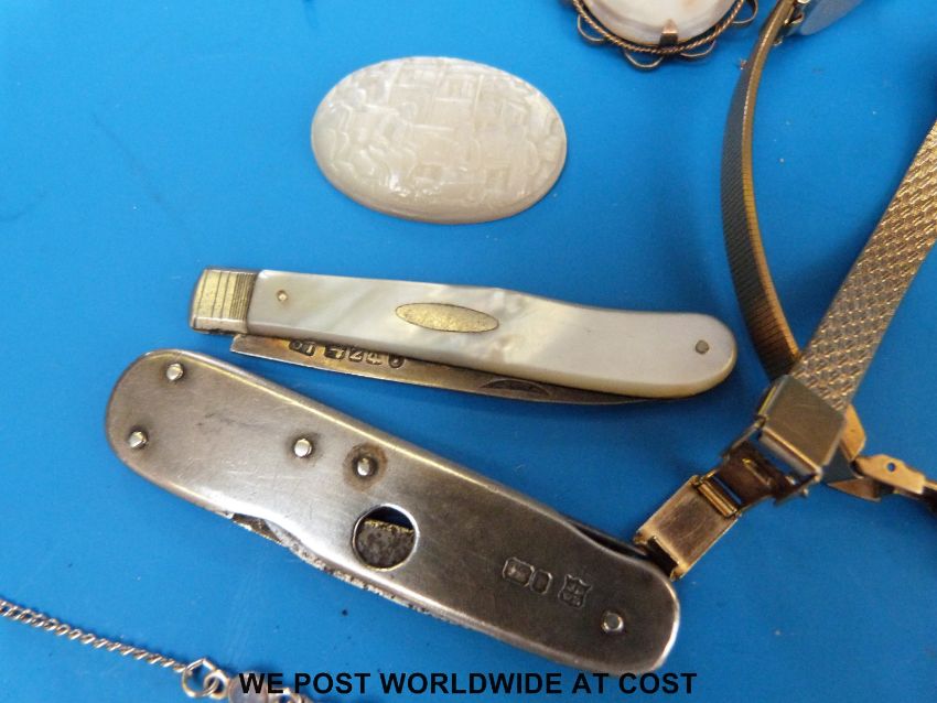 Two hallmarked silver pen knives, mother of pearl counter, Charles Horner thimble, silver fede gimmel ring, silver brooches etc