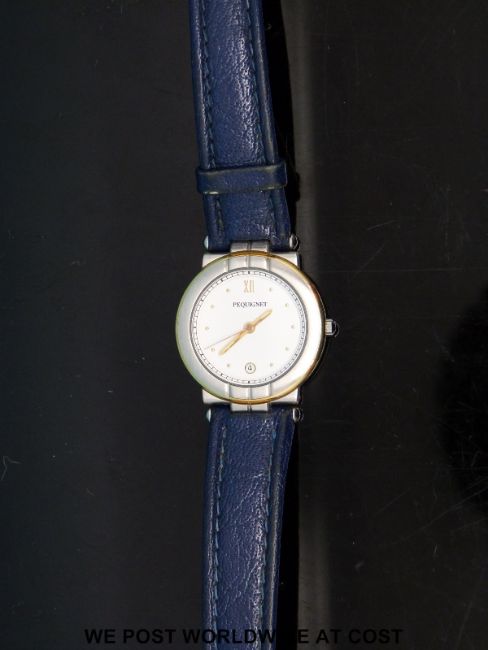 Pequignet ladies wristwatch with gold hands and markers and date aperture on white face, in stainless steel and gold plated case marked to the back 7682318, on blue leather strap, case diameter 26mm