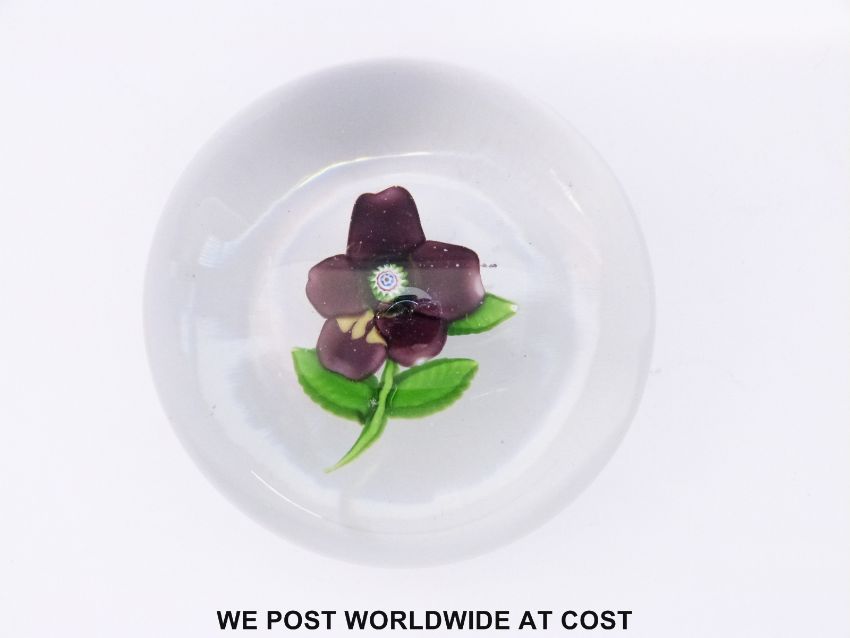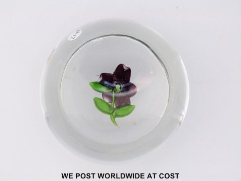 St Louis pansy glass paperweight, the central flower with purple and yellow petals and green leaves and stem, 78mm in diameter