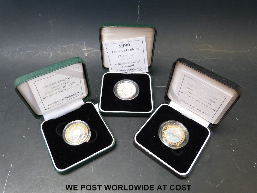 A silver proof cased Piedfort Rugby World Cup 1999 £2 coin, together with a silver proof example, and a 1996 Celebration of Football, all with certificates