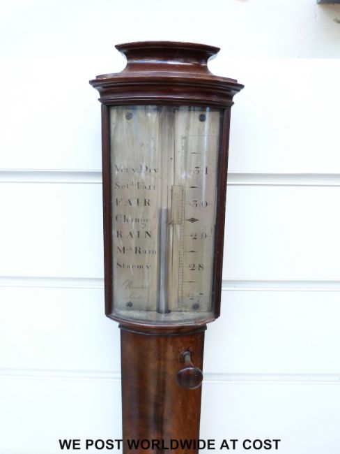 A Georgian flame mahogany stick barometer by Ramsden, London with Vernier moveable scale