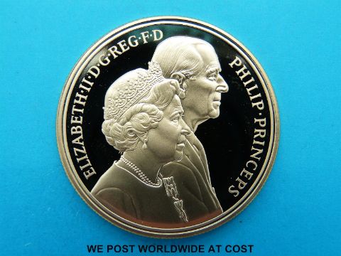 A £5 gold coin 1997 to commemorate The Queen's Golden Wedding Anniversary, coat of arms on reverse