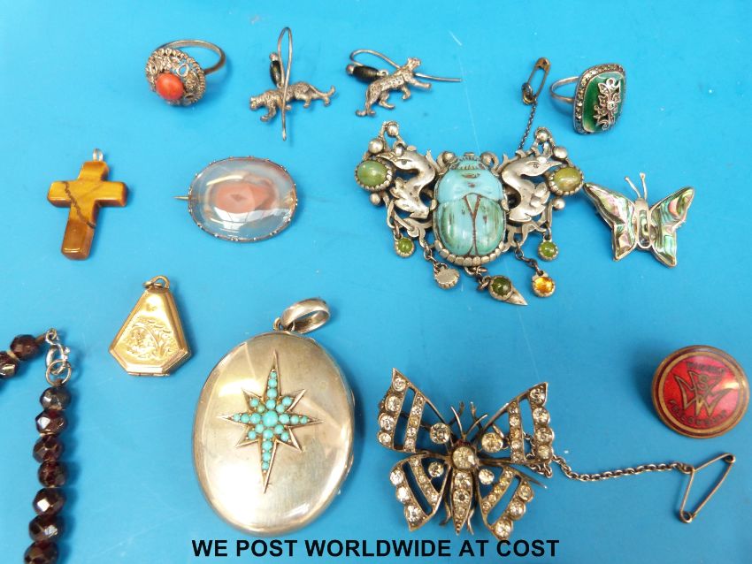 A white metal brooch in the form of a scarab beetle, agate brooch, silver brooch in the form of a pheasant, silver brooch in the form of a butterfly, two silver rings, silver earrings and pendants etc