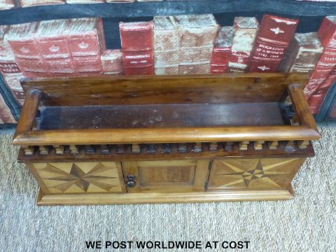 An early 20thC apprentice small free standing parquetry cabinet with gallery above. Made by the vendor's great grandfather (width 51cm, depth 15cm, height 23cm)