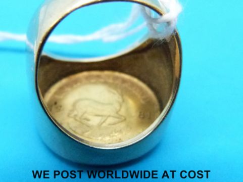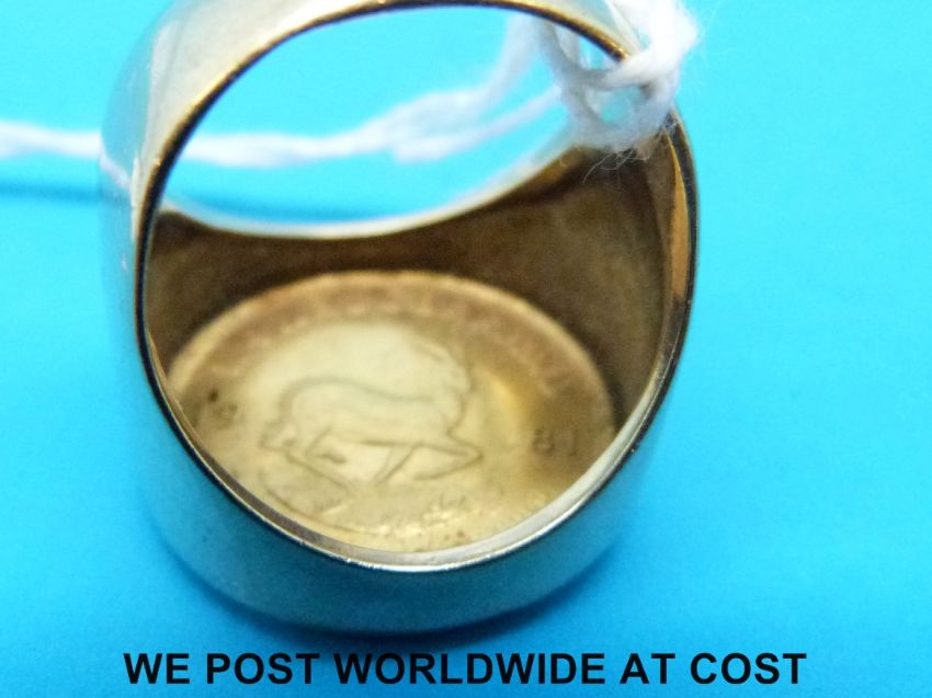 A 9ct gold ring set with a 1981 1/4 oz Krugerrand (21.3g)